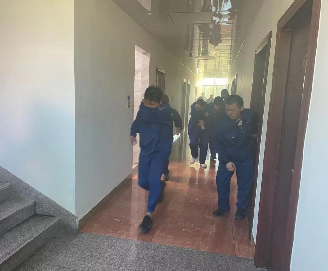 模擬員工宿舍突然起火,火勢(shì)發(fā)展迅猛并產(chǎn)生大量濃煙,通知每間宿舍內(nèi)人員進(jìn)行撤離至廠區(qū)大門口安全地點(diǎn),人員撤離時(shí)應(yīng)低頭彎腰、手捂住口鼻有序進(jìn)行撤離。待所有人員撤離至安全地點(diǎn)時(shí),清點(diǎn)人員。上報(bào)公司并撥打119進(jìn)行報(bào)警。